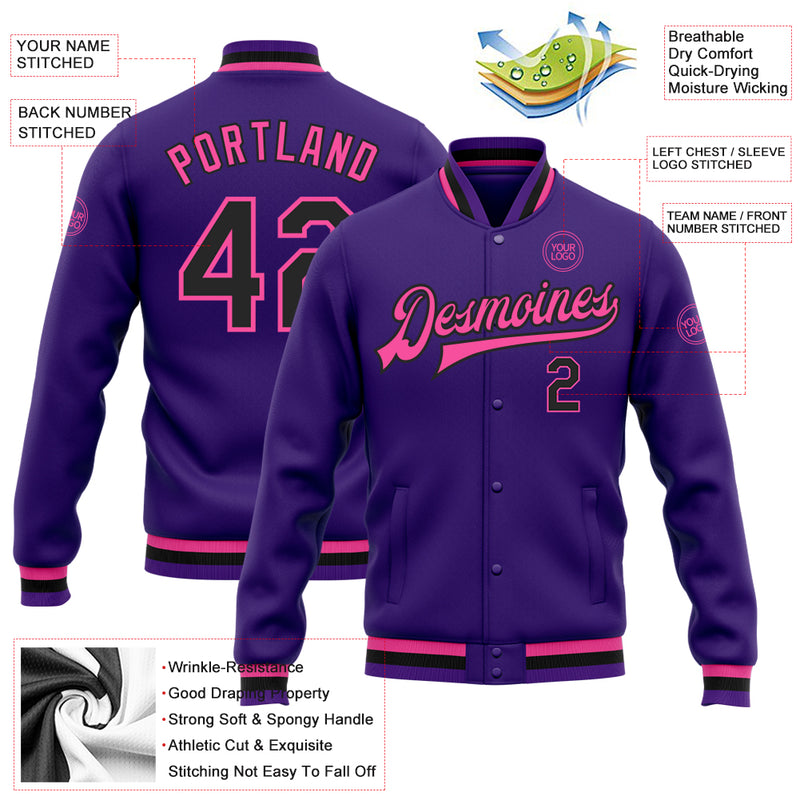 Custom Purple Black-Pink Bomber Full-Snap Varsity Letterman Jacket
