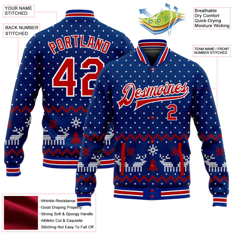 Custom Royal Red-White Christmas 3D Bomber Full-Snap Varsity Letterman Jacket