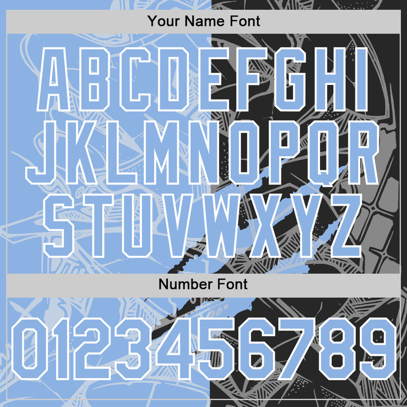 Custom Graffiti Pattern Light Blue Black-White Scratch Bomber Full-Snap Varsity Letterman Hoodie Jacket