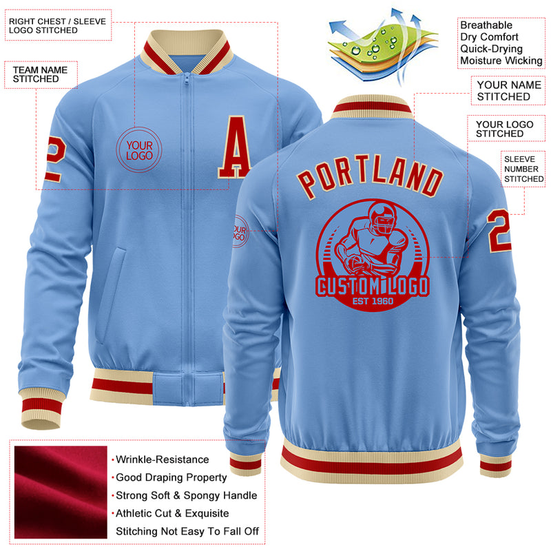Custom Light Blue Red-Cream Bomber Varsity Letterman Zipper Jacket