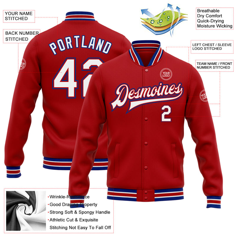 Custom Red White-Royal Bomber Full-Snap Varsity Letterman Jacket