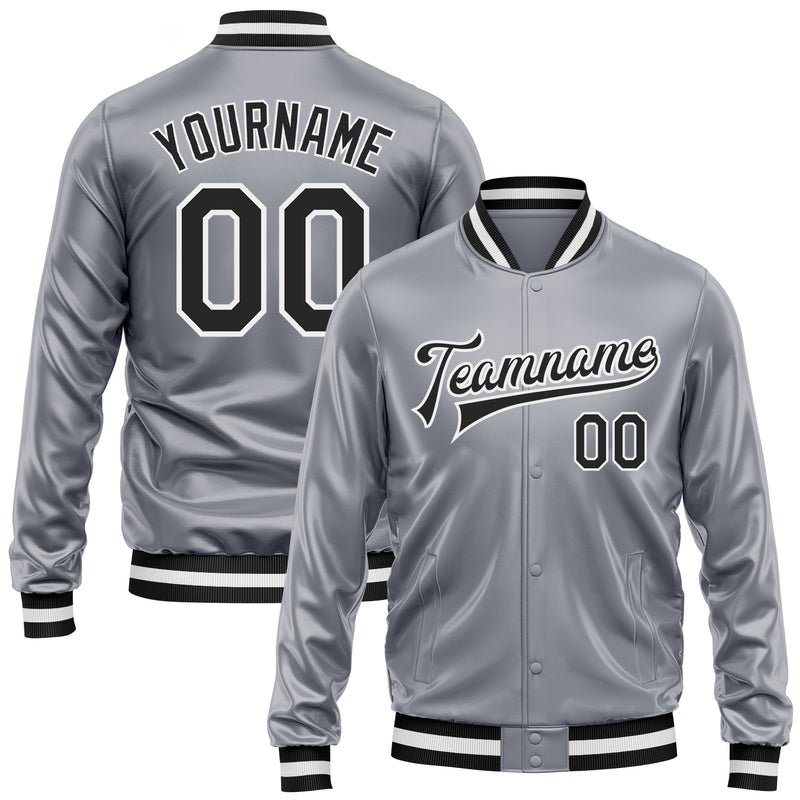 Custom Gray Black-White Bomber Full-Snap Varsity Faux Leather Letterman Jacket