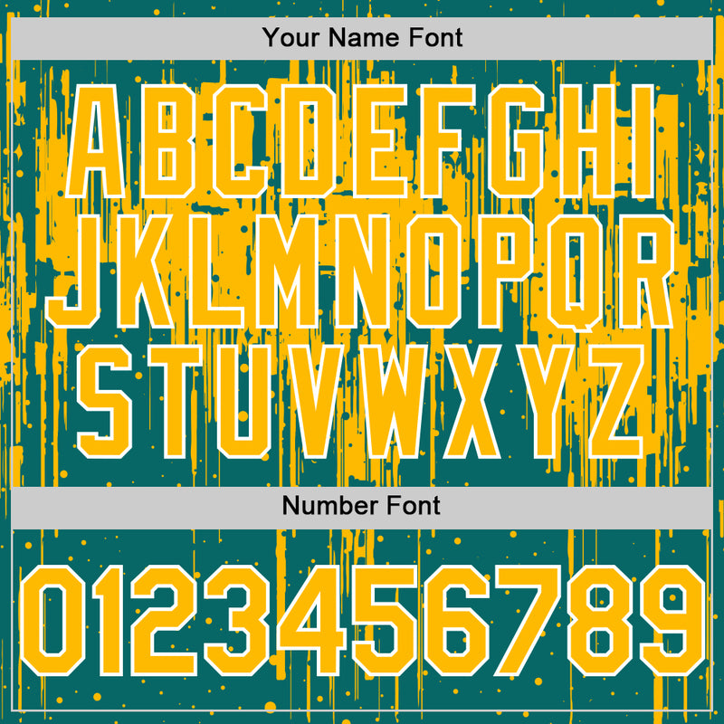 Custom Teal Gold-White Dripping Splatter Bomber Full-Snap Varsity Letterman Hoodie Jacket