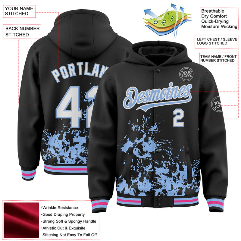 Custom Black White Light Blue-Pink Splash Art 3D Pattern Design Bomber Full-Snap Varsity Letterman Hoodie Jacket