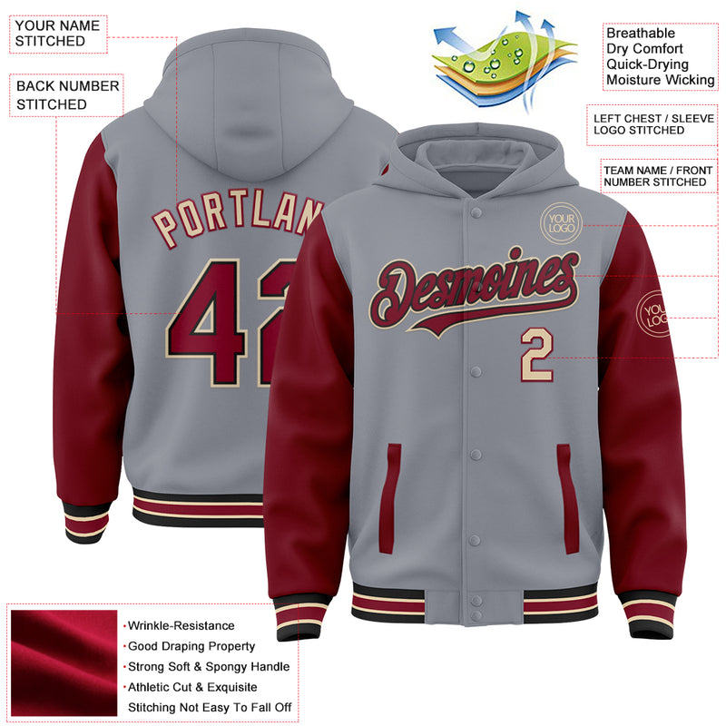 Custom Gray Crimson Black-City Cream Bomber Full-Snap Varsity Letterman Two Tone Hoodie Jacket