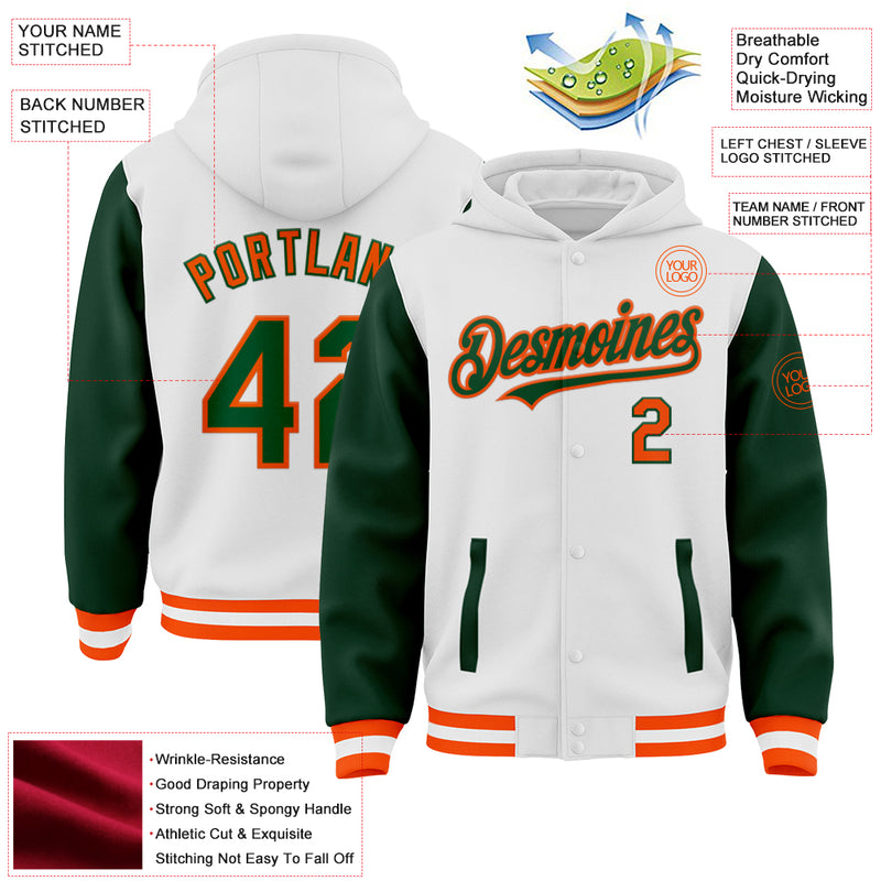 Custom White Green-Orange Bomber Full-Snap Varsity Letterman Two Tone Hoodie Jacket