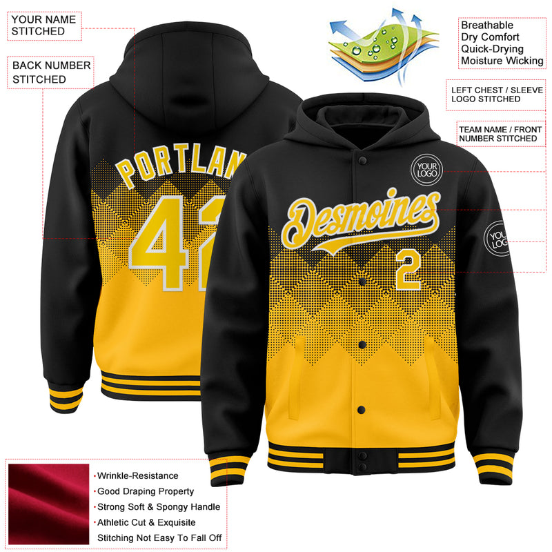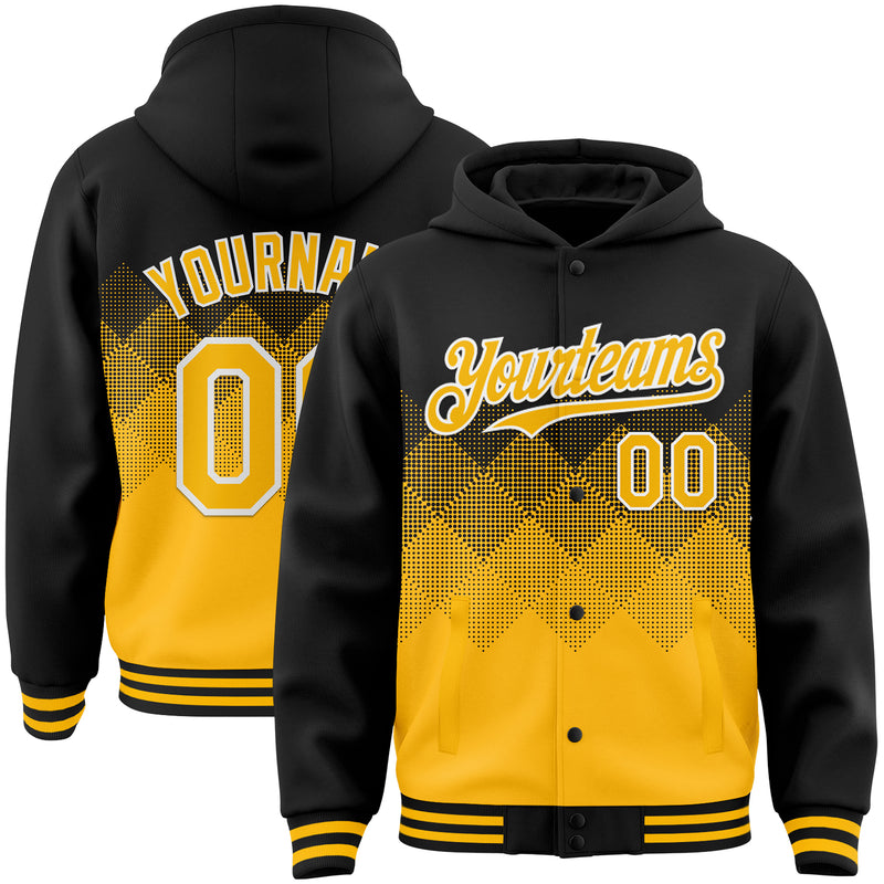 Custom Black Gold-White Gradient Square Shape 3D Pattern Design Bomber Full-Snap Varsity Letterman Hoodie Jacket