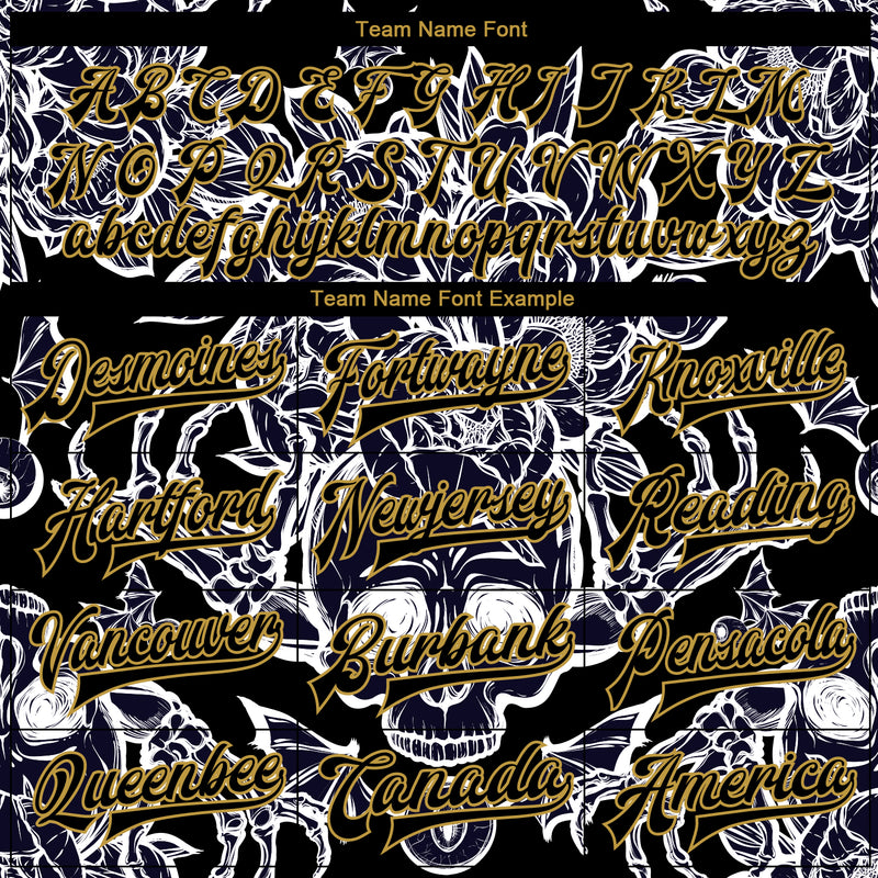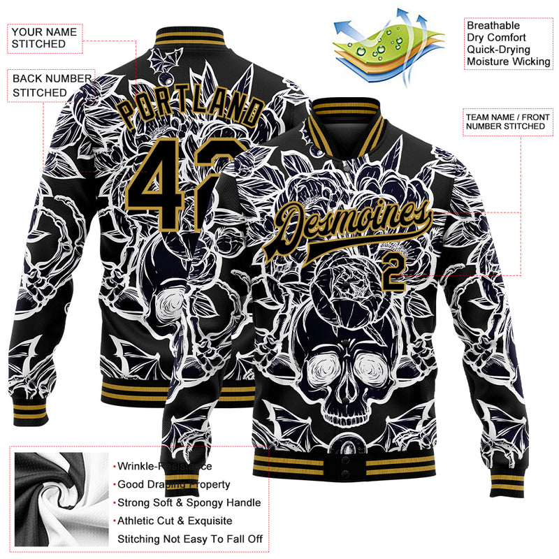 Custom Black Old Gold Skull With Peonies 3D Bomber Full-Snap Varsity Letterman Jacket