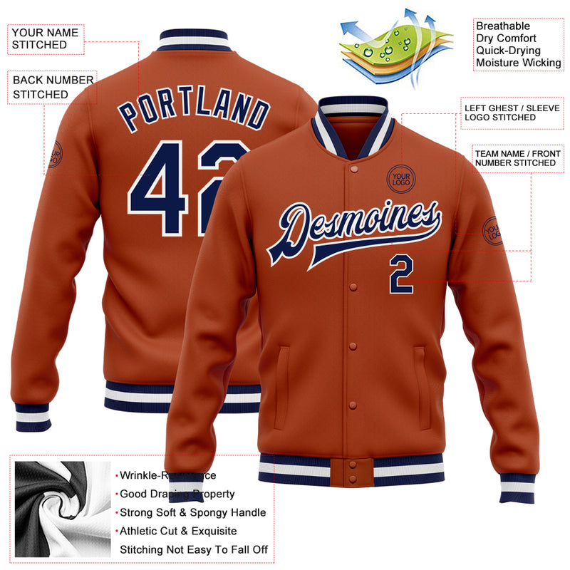 Custom Texas Orange Navy-White Bomber Full-Snap Varsity Letterman Jacket
