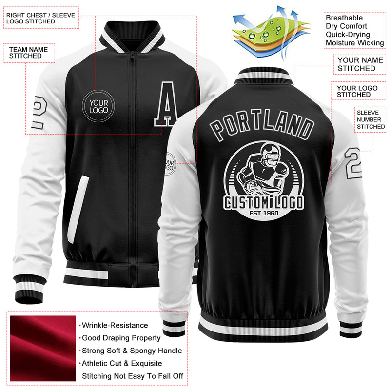 Custom Black White Bomber Varsity Letterman Two Tone Zipper Jacket