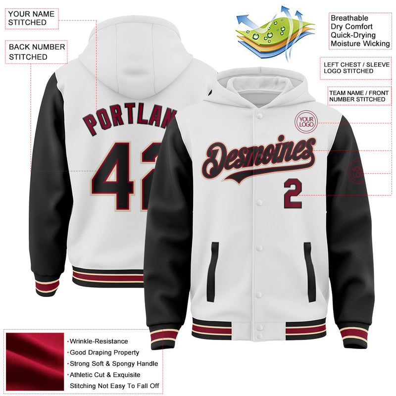 Custom White Black Crimson-City Cream Bomber Full-Snap Varsity Letterman Two Tone Hoodie Jacket