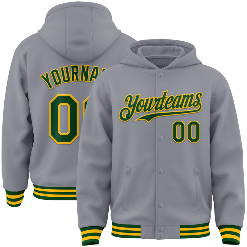 Custom Gray Green-Gold Bomber Full-Snap Varsity Letterman Hoodie Jacket