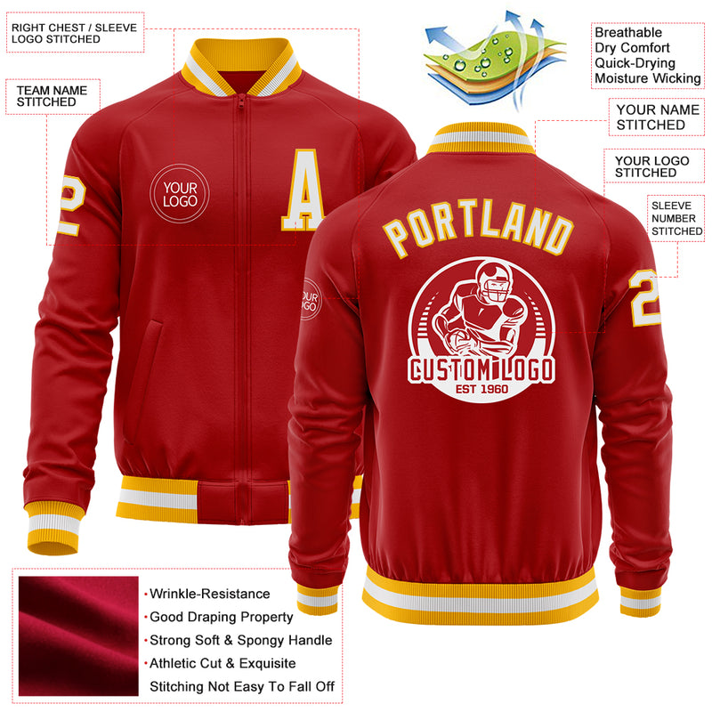 Custom Red White-Gold Bomber Varsity Letterman Zipper Jacket