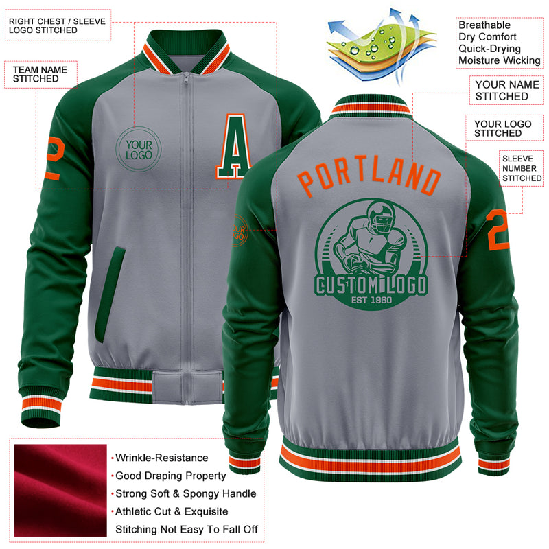 Custom Gray Orange-Kelly Green Varsity Letterman Two Tone Zipper Jacket