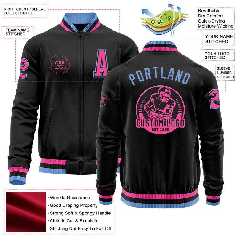 Custom Black Pink-Light Blue Bomber Varsity Letterman Zipper Jacket