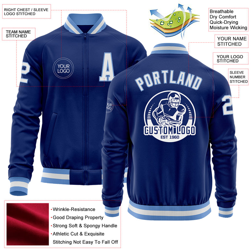 Custom Royal White-Light Blue Bomber Varsity Letterman Zipper Jacket
