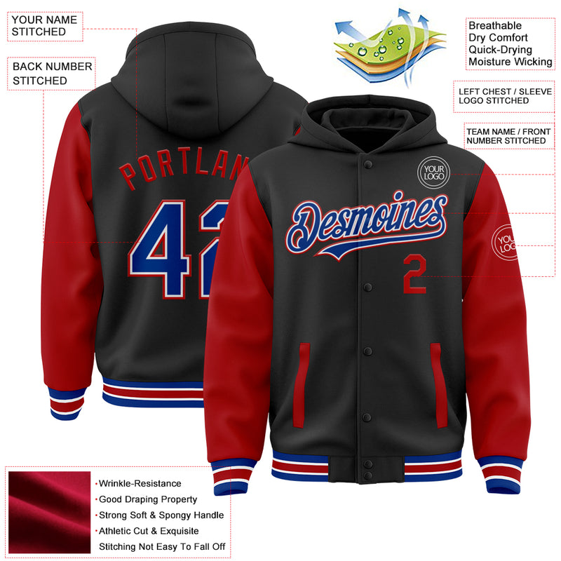 Custom Black Royal-Red Bomber Full-Snap Varsity Letterman Two Tone Hoodie Jacket