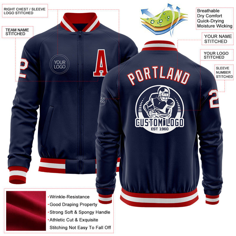 Custom Navy White-Red Bomber Varsity Letterman Zipper Jacket