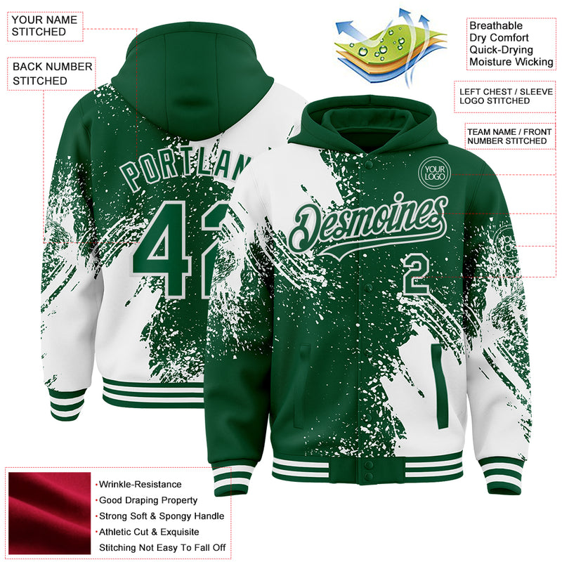 Custom Kelly Green White Abstract Brush Stroke 3D Pattern Design Bomber Full-Snap Varsity Letterman Hoodie Jacket