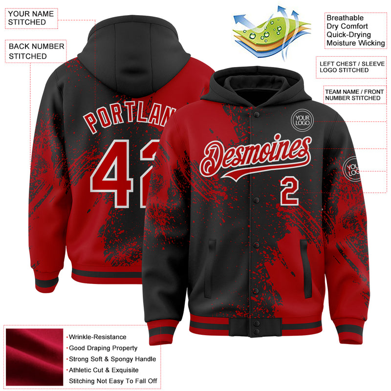 Custom Black Red-White Abstract Brush Stroke 3D Pattern Design Bomber Full-Snap Varsity Letterman Hoodie Jacket