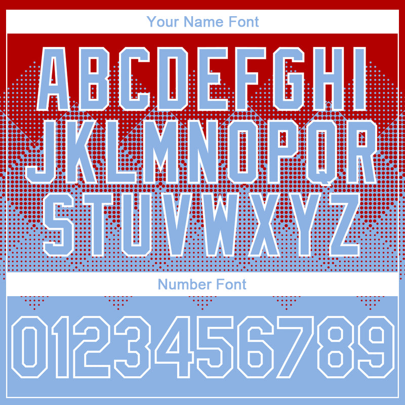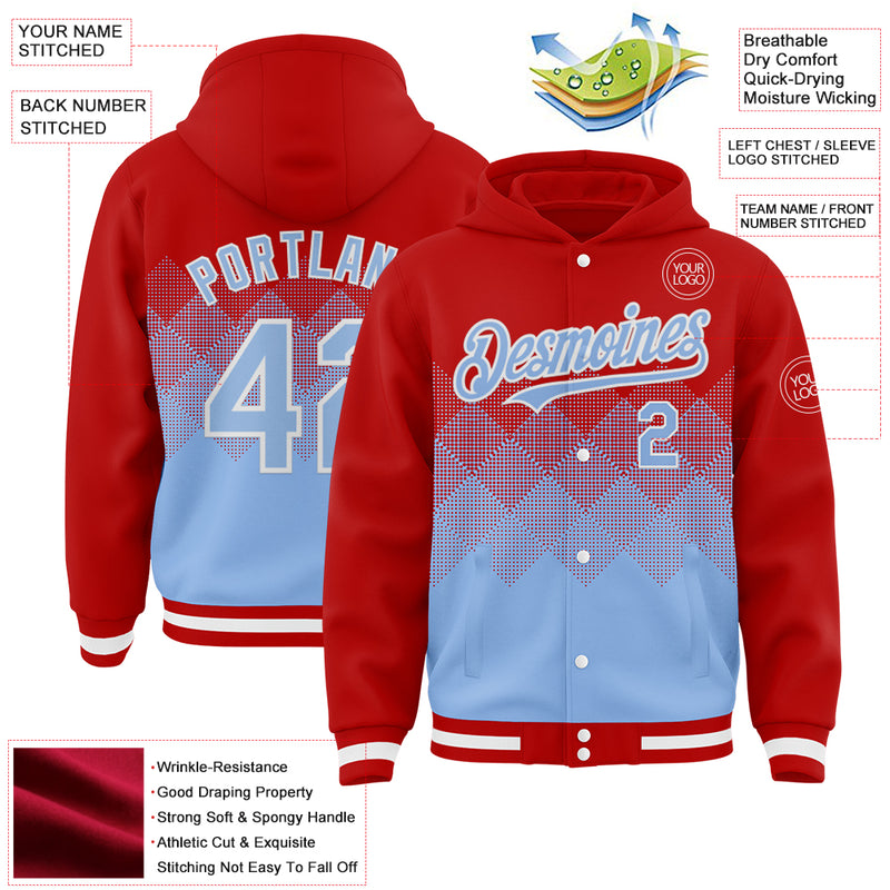 Custom Red Light Blue-White Gradient Square Shape 3D Pattern Design Bomber Full-Snap Varsity Letterman Hoodie Jacket