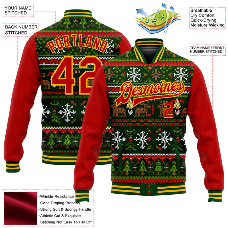 Custom Green Red-Gold Christmas 3D Bomber Full-Snap Varsity Letterman Jacket