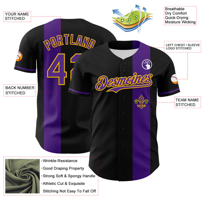 Custom Black Purple-Gold 3D Pattern Design Mardi Gras Shrove Tuesday Authentic Baseball Jersey