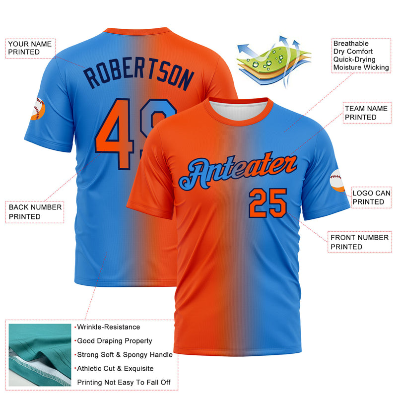 Custom Powder Blue Orange-Navy Gradient Fashion Performance T-Shirt