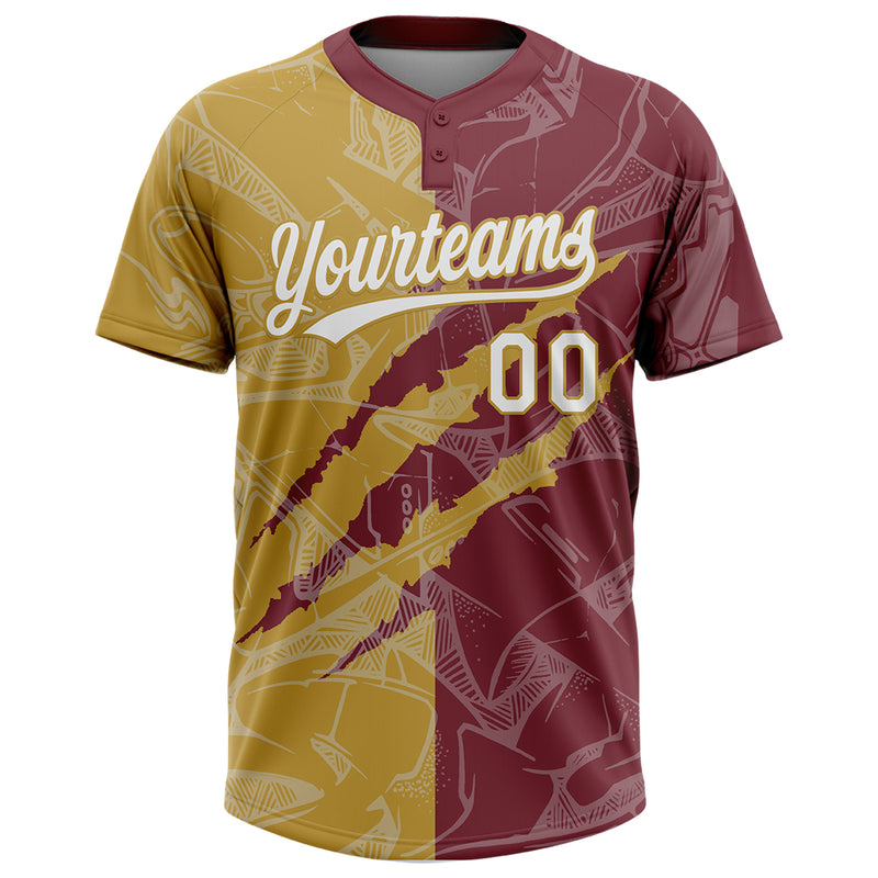 Custom Graffiti Pattern White Burgundy-Old Gold 3D Scratch Two-Button Unisex Softball Jersey