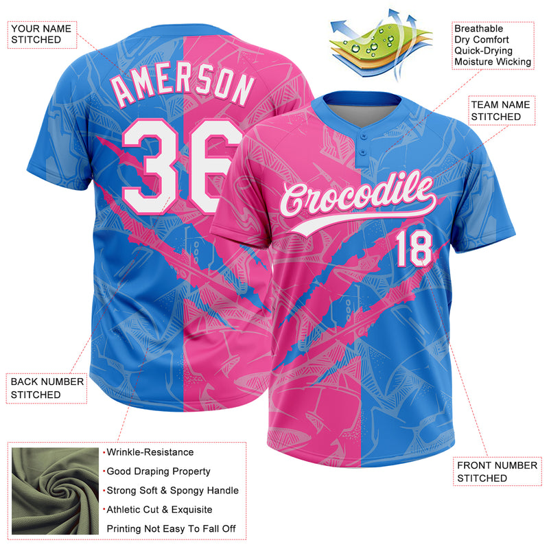 Custom Graffiti Pattern White Electric Blue-Pink 3D Scratch Two-Button Unisex Softball Jersey
