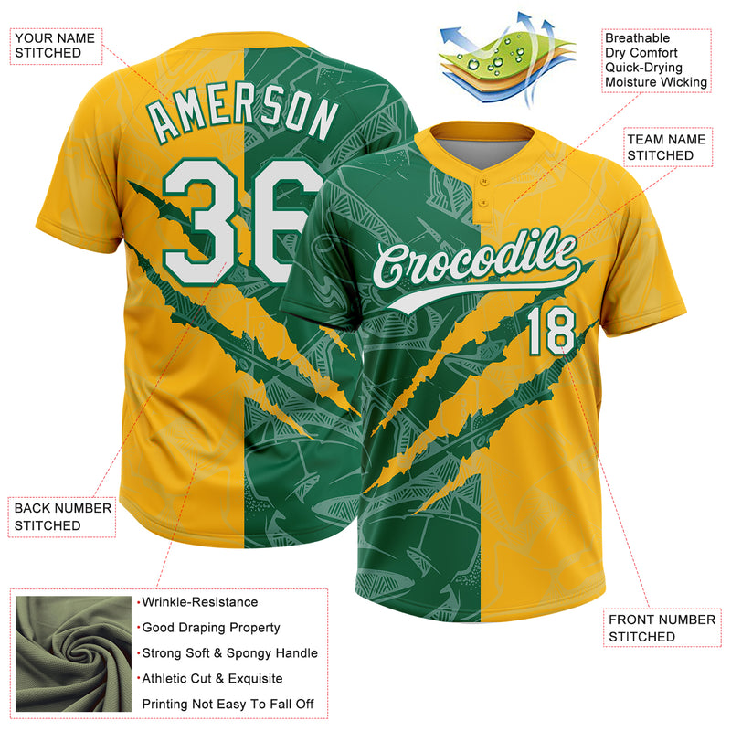 Custom Graffiti Pattern White Gold-Kelly Green 3D Scratch Two-Button Unisex Softball Jersey