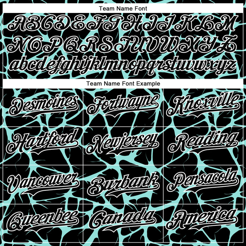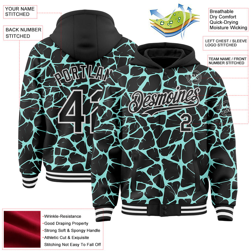 Custom Black Ice Blue-White Abstract Network Bomber Full-Snap Varsity Letterman Hoodie Jacket