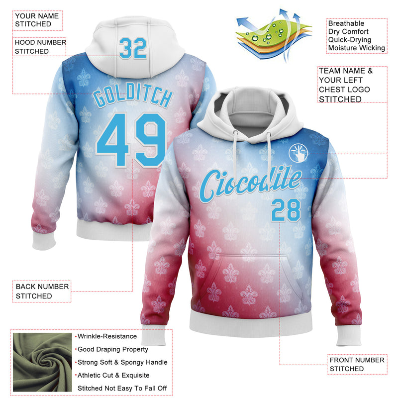 Custom Stitched White Sky Blue Red-Blue 3D Pattern Design American French Inspired Sportswear Pullover Sweatshirt Hoodie