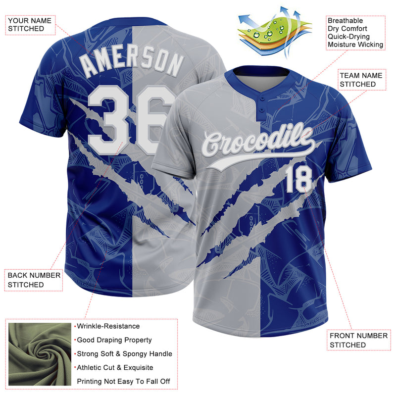 Custom Graffiti Pattern White Royal-Gray 3D Scratch Two-Button Unisex Softball Jersey