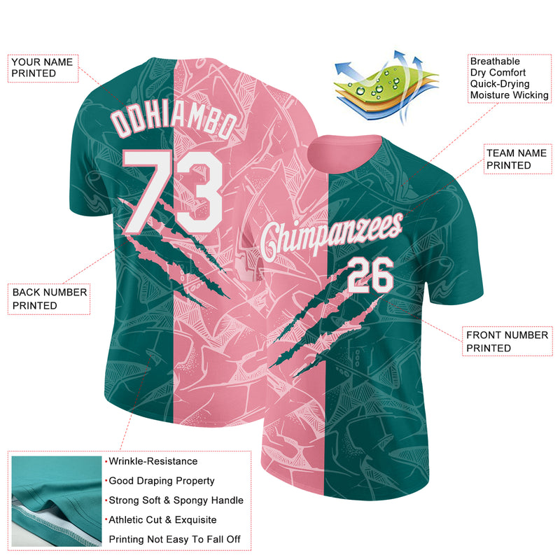 Custom Graffiti Pattern White Teal-Medium Pink Scratch 3D Performance T-Shirt