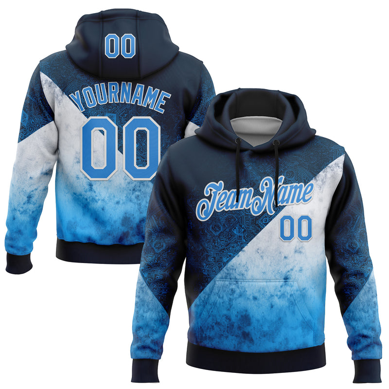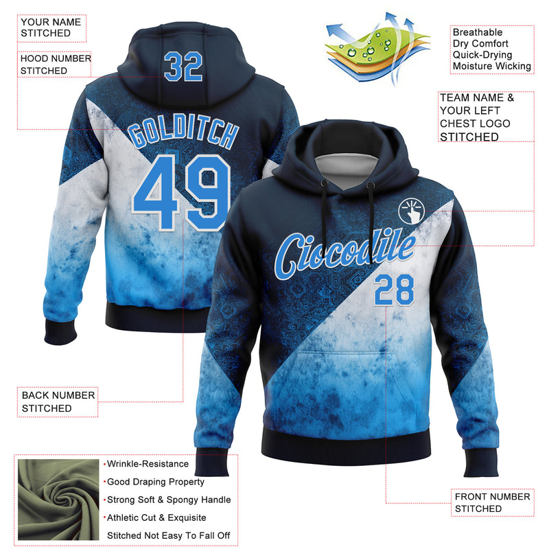 Custom Stitched Blue Powder Blue-White 3D Pattern Design Argentine Inspired Geometric Tribal Watercolor Sportswear Pullover Sweatshirt Hoodie