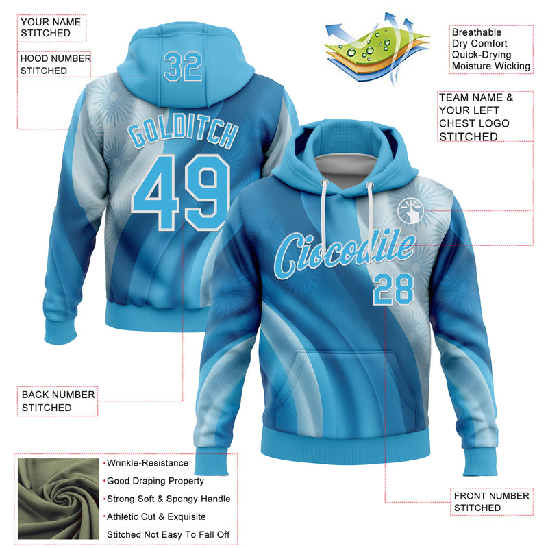 Custom Stitched Blue Sky Blue-White 3D Pattern Design Argentine Inspired Subtle Floral Sportswear Pullover Sweatshirt Hoodie