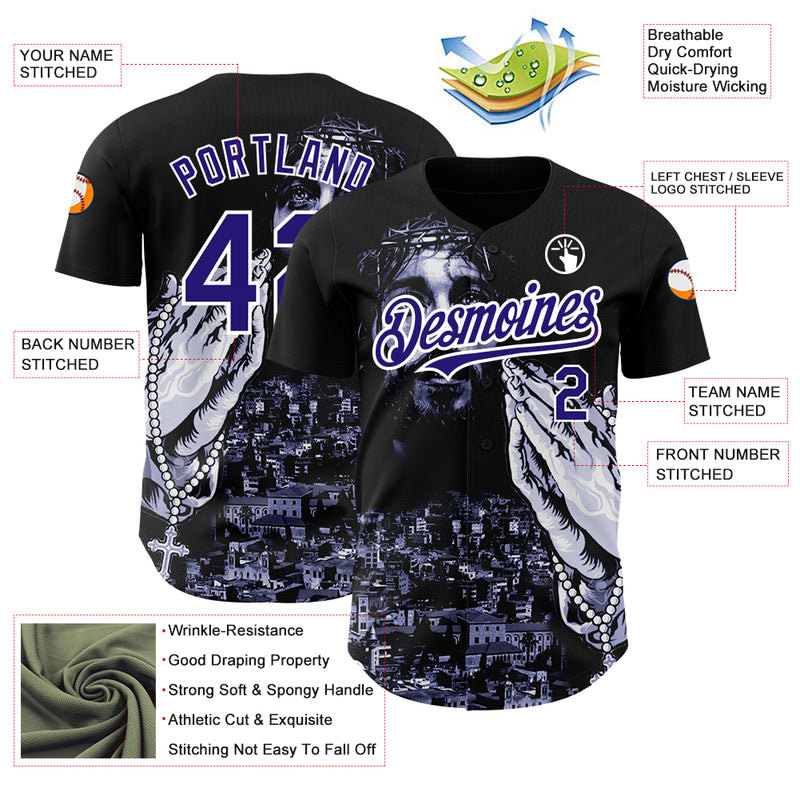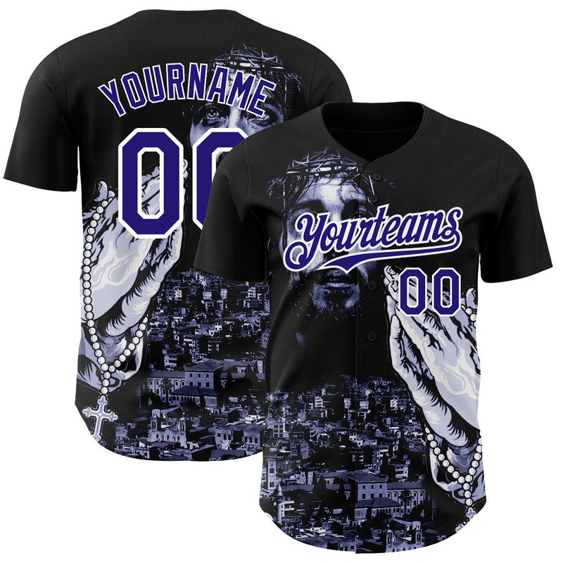 Custom Black Purple-White 3D Pattern Design Religion Jesus Christ Authentic Baseball Jersey