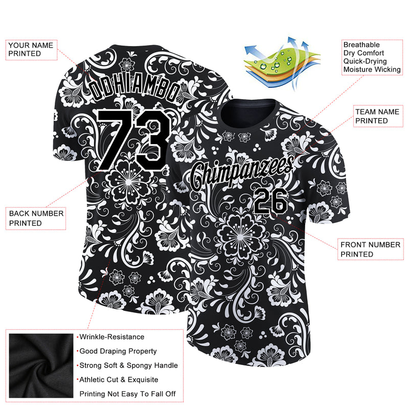 Custom Black White 3D Pattern Floral Design Performance T-Shirt