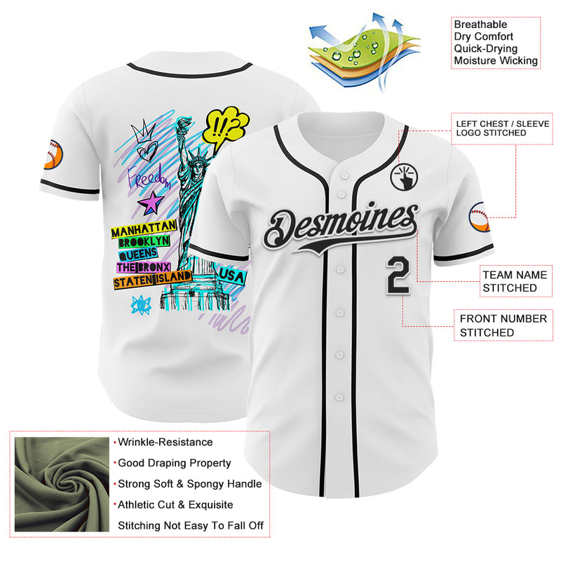Custom White Black 3D Pattern Design Patriotic American Symbol Statue of Liberty Authentic Baseball Jersey
