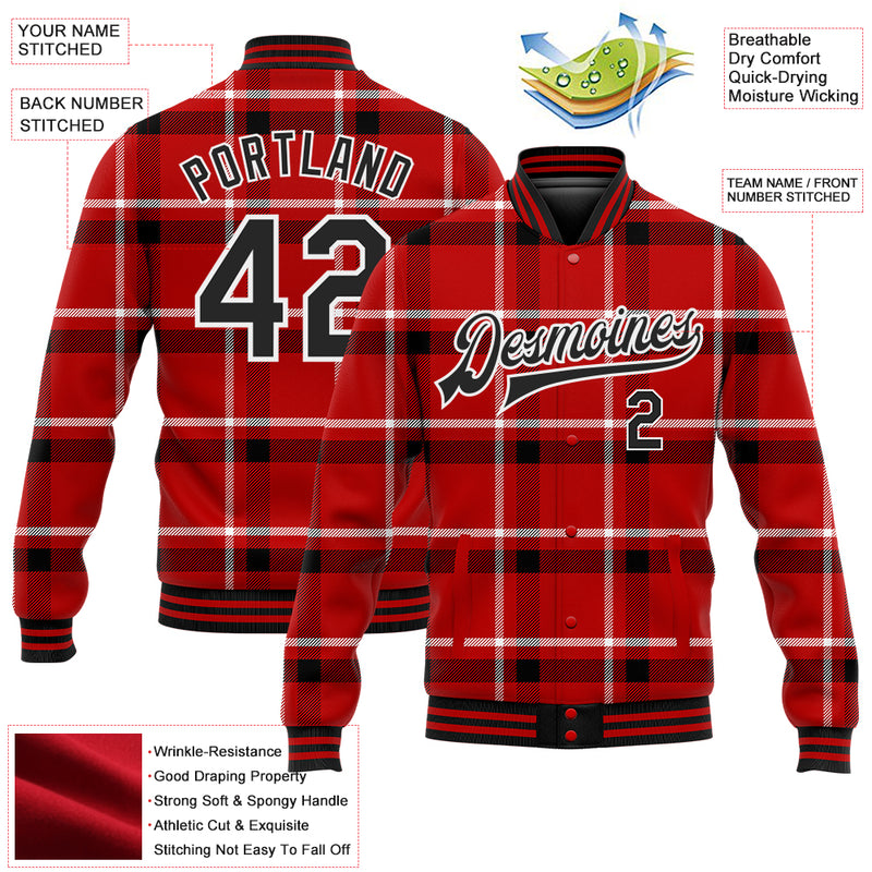 Custom Red Black-White Classic Western Plaid 3D Pattern Design Bomber Full-Snap Varsity Letterman Jacket