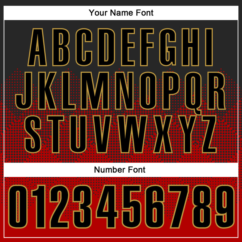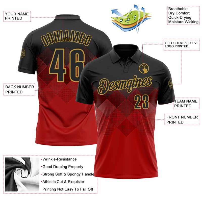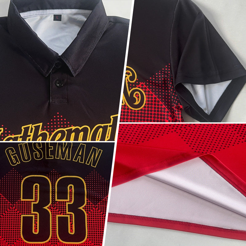 Custom Black Red-Old Gold 3D Pattern Design Gradient Square Shape Performance Polo Shirt