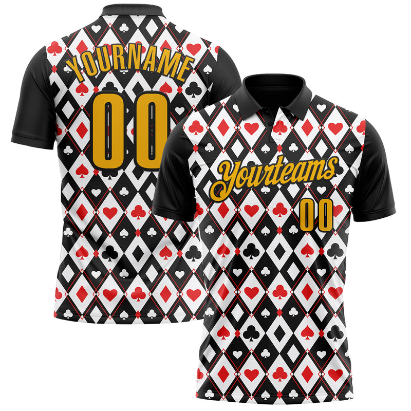 Custom Black Gold-White 3D Gambling Poker Performance Polo Shirt