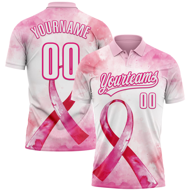 Custom Pink White-Hot Pink 3D Pink Ribbon Breast Cancer Awareness Month Women Health Care Support Performance Polo Shirt