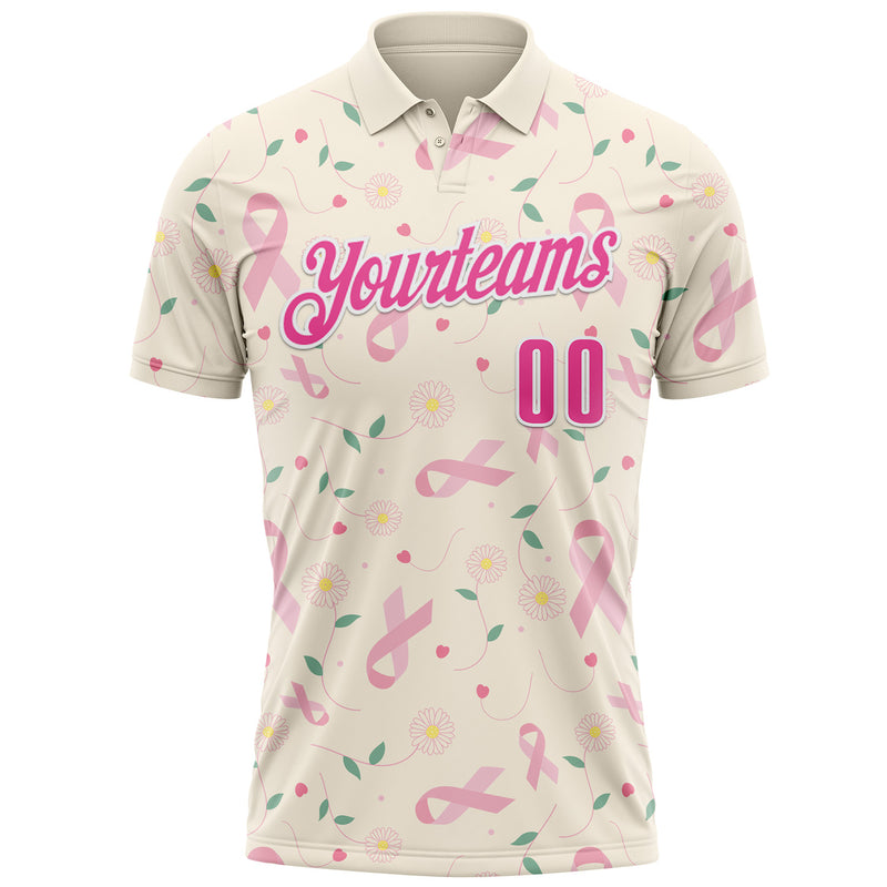 Custom Cream Pink-White 3D Pink Ribbon Breast Cancer Awareness Floral Performance Polo Shirt