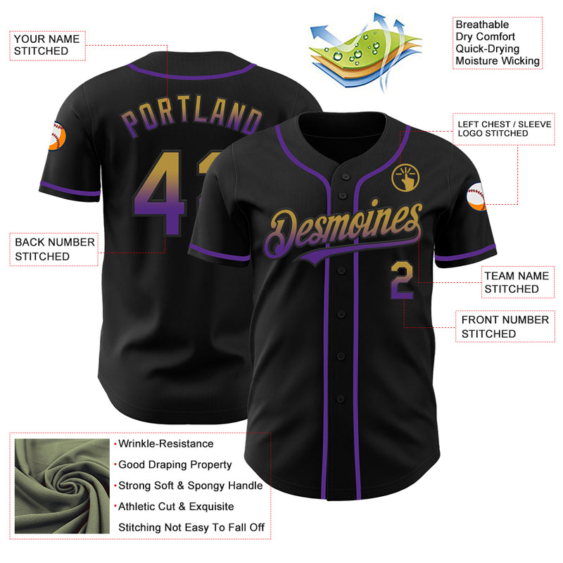 Custom Black Old Gold-Purple Authentic Fade Fashion Baseball Jersey