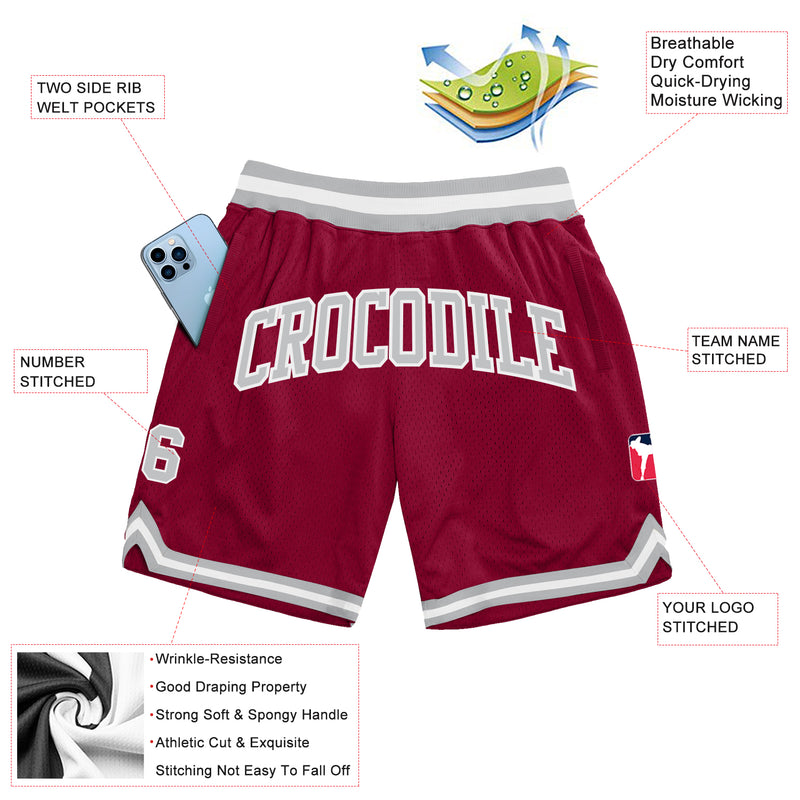 Custom Maroon Gray-White Authentic Throwback Basketball Shorts