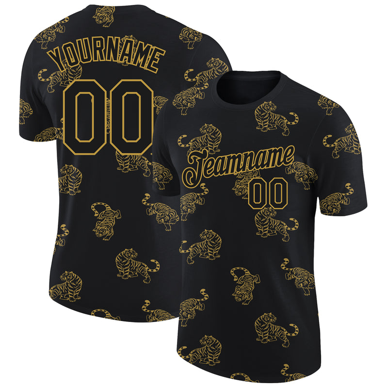 Custom Black Old Gold 3D Pattern Design Tiger Performance T-Shirt