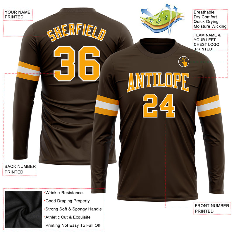 Custom Brown Gold-White Long Sleeve Performance T-Shirt