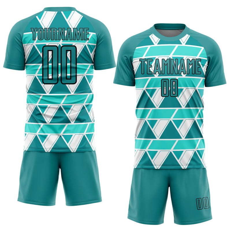 Custom Teal White-Black Geometric Shapes Sublimation Soccer Uniform Jersey